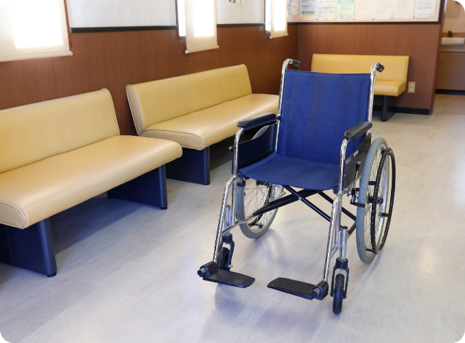 足の不自由な方は当院の車椅子をご利用ください。 車椅子への移乗や移動はお手伝い致しますので、お声がけ下さい。