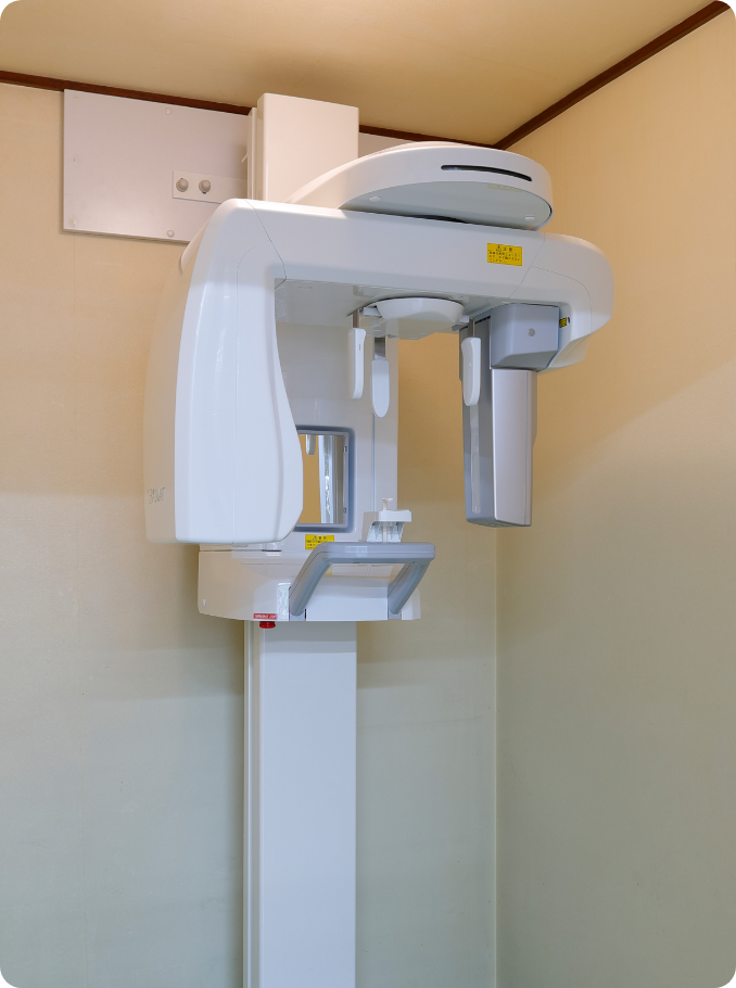 1回の撮影で、上下の顎、全ての歯、顎関節、鼻腔周囲など口腔全体を映すことができます。 放射線量は極めて少なく、安全な装置です。新機種を導入し、従来よりも解像度が向上しました。
