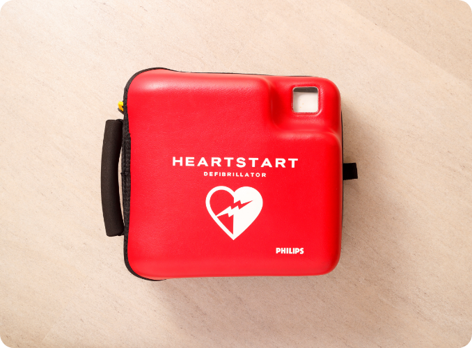 心室細動(心臓が痙攣し、血流を送り出すポンプ機能を失った状態)が起きた際に、心臓に電気を与え、正常なリズムに戻すための医療機器です。 緊急時の対応ついて、院内で研修を行っております。